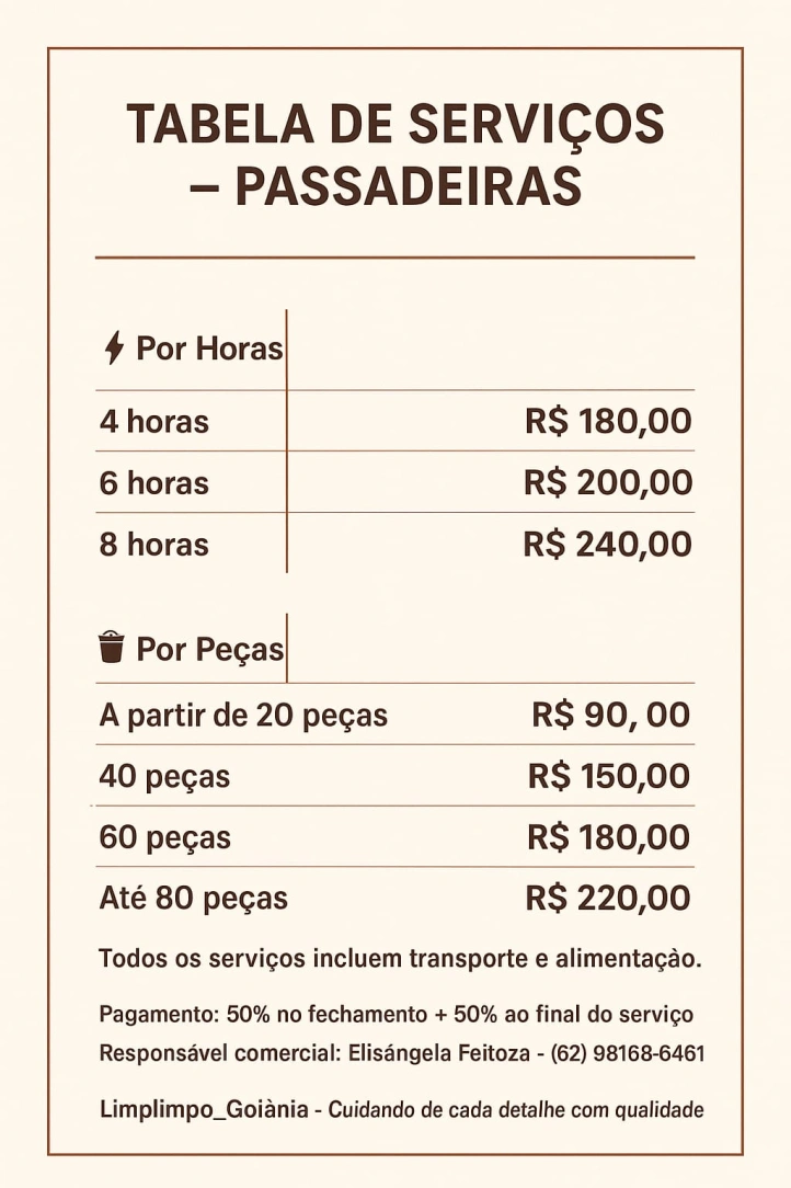 Passar roupas é uma tarefa que exige cuidado , e para que o serviço eja realizado de forma adequada e satisfatório é importante que o prestador da limplimpo tenha os utensílios necessários para executar a função, tais como. Ferro de passar em João condições, Tábua de roupas e extensão um barrufador água de passar da sua preferência. Um local adequado para realizar o atendimento, sendo estes de total responsabilidade do cliente.